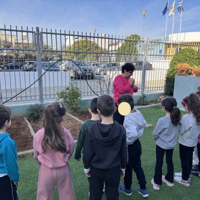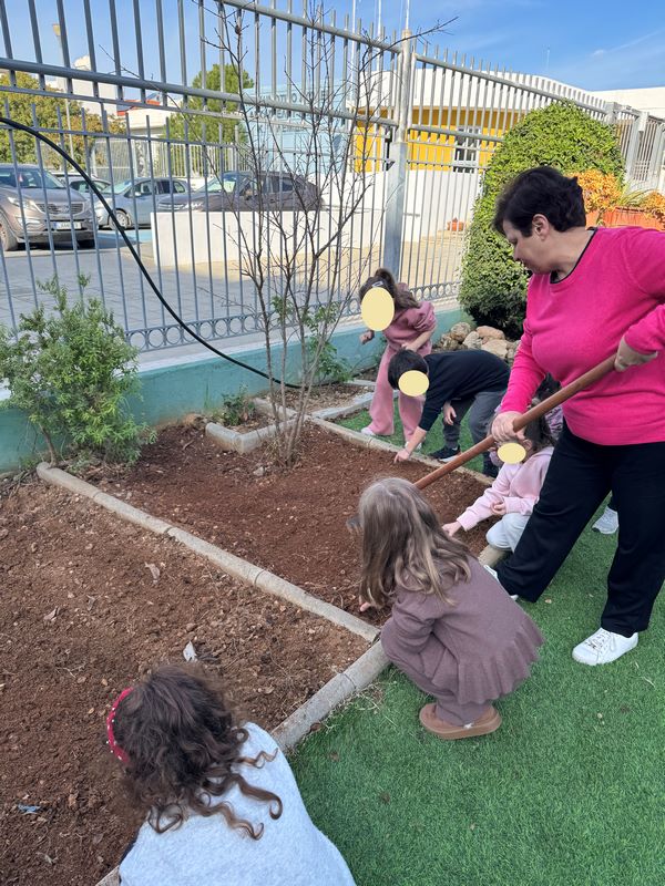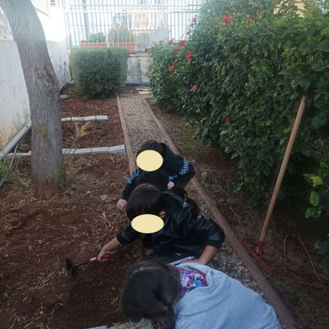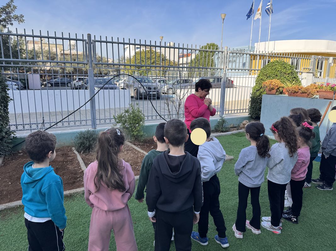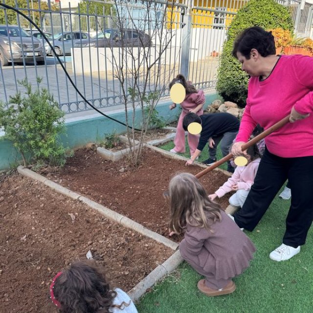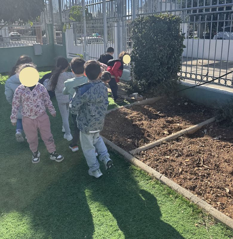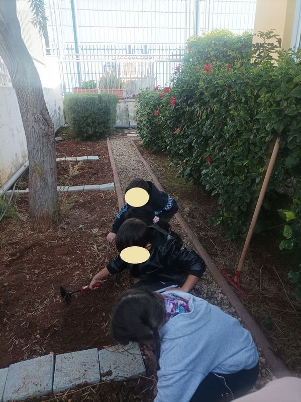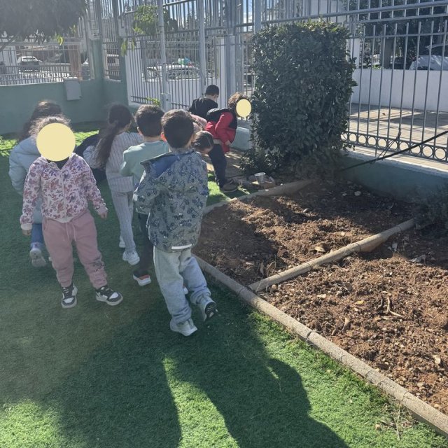 Τα παιδιά είχαν την ευκαιρία να εξερευνήσουν την αυλή του νηπιαγωγείου και εντόπισαν τα δέντρα, τα φυτά, τους θάμνους και τα λουλούδια που υπάρχουν σε αυτή. Στη συνέχεια υζήτησαν ποια από αυτά τους αρέσουν και ποιες αλλαγές θα ήθελαν να δουν και εντόπισαν το κατάλληλο σημείο για το λαχανόκηπο, σχεδιάζοντας τι θα φυτέψουν.