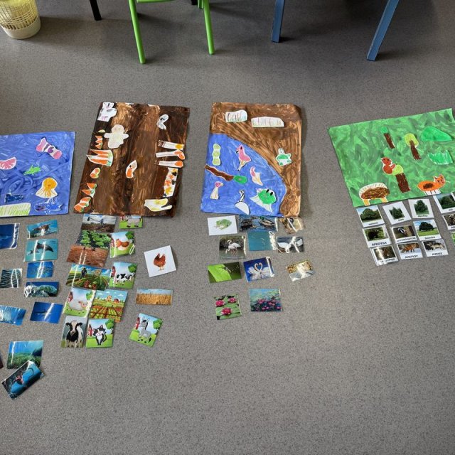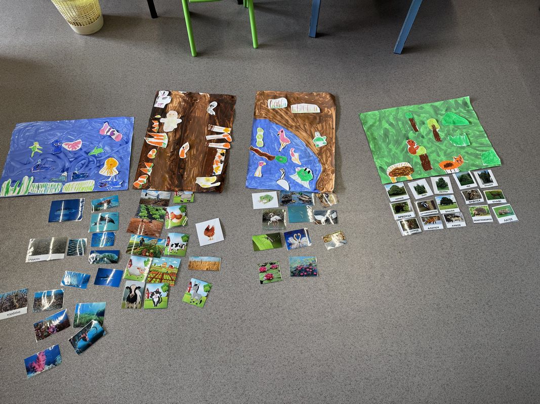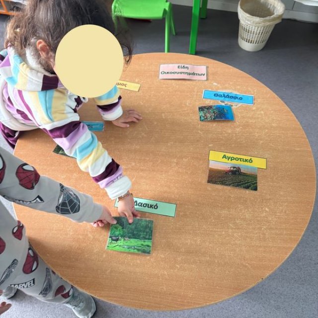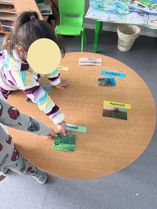 Έπειτα τα παιδιά γνώρισαν τα διάφορα οικοσυστήματα που υπάρχουν όπως το δασικό, του πάγου, της ερήμου, του υδροβιότοπου, του θαλάσσιου. Στη συνέχεια αντιστοίχισαν τα οικοσυστήματα με τα ανάλογα φυσικά στοιχεία – ζώα, φυτά κτλ.